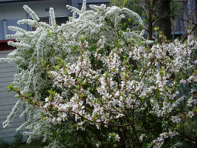 上のしゃしんはユスラウメとユキヤナギ.下ははわかりません.雑草?