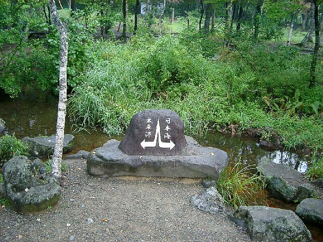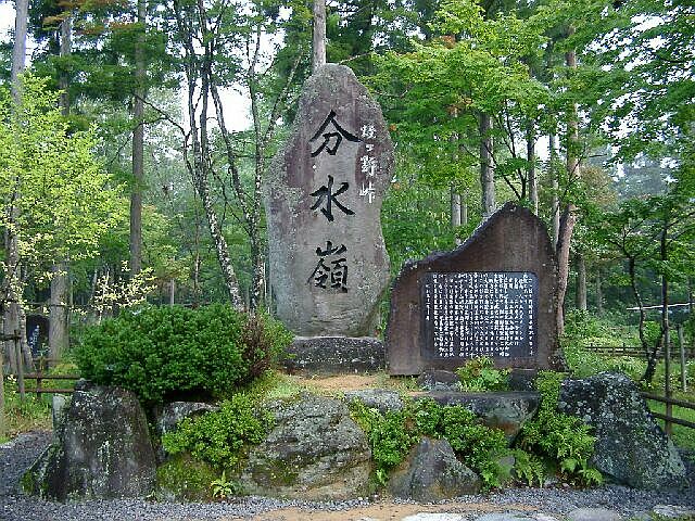 | 何が分水かと言うと, この石碑(?)の左上,右上から 水が集まってきて, 左下に流れていくと長良川となり伊勢湾へ, 右下に流れていくと庄川となり富山湾へたどり着くという 太平洋と日本海が分かれる地点です. |