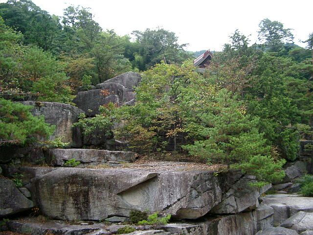 | ちらっと見える屋根が浦島堂. 浦島太郎がここ寝覚の床で玉手箱を開けたらしい. |
