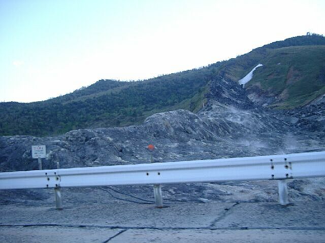 | 危険!有毒ガス発生につき停車禁止! というわけで動いてる車内から撮影. 右のほうで有毒ガスがもわっと湧き出してるのがわかるかも. けど,硫化水素と温泉の硫黄臭さって同じじゃないの? |